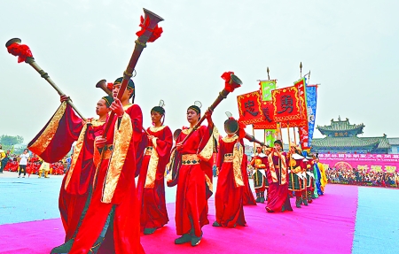 9月25日上午,2013中國(guó)洛陽(yáng)關(guān)林國(guó)際朝圣大典開(kāi)幕式在關(guān)林廟廣場(chǎng)隆重舉行,場(chǎng)面恢宏,給中外游客帶來(lái)一道豐盛的文化大餐。 潘炳郁 曹福川 攝