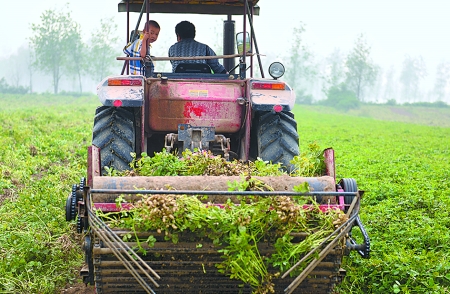 9月22日,素有全國(guó)第一花生大縣的正陽(yáng)縣150萬(wàn)畝花生已進(jìn)入大規(guī)模收獲期,各鄉(xiāng)鎮(zhèn)農(nóng)民投入大量機(jī)械,抓緊時(shí)間搶收,確;ㄉw粒歸倉(cāng)。 王 珺 攝