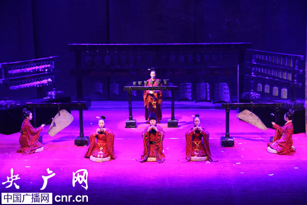 伴隨著婉轉(zhuǎn)悠揚(yáng)的古琴曲,步履輕盈的舞女在盤與鼓間踏節(jié)倒拍、俯仰往來、若奔若翔,以優(yōu)美的舞姿將漢代《七盤舞》完美呈現(xiàn);特磬的清脆響聲和著古琴的優(yōu)雅旋律,將《詩經(jīng)?周南?關(guān)雎》中青年男子思念溫柔美麗姑娘的故事娓娓道來;傳統(tǒng)中國鼓與彈撥樂器琵琶兩種截然不同音色的巧妙融合,和著中國傳統(tǒng)戲劇中打擊樂的節(jié)奏,詮釋出新穎別致的《商調(diào)?水底魚》。