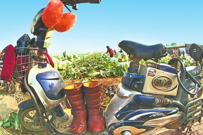 央廣網(wǎng)河南分網(wǎng)消息 據(jù)河南日報報道:今年夏邑縣種植的3萬多畝大白菜取得豐收。12月7日,李集鎮(zhèn)的菜地里,打工者脫下皮靴,彎下身子收菜,他們?nèi)帐杖肟蛇_(dá)80~100元。(記者 王天定 攝)