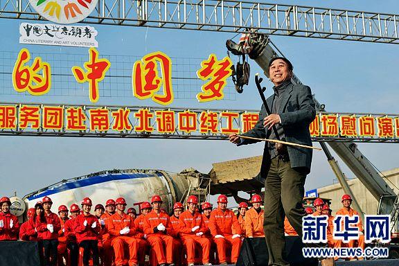當(dāng)日,由中國文聯(lián)和國務(wù)院南水北調(diào)辦公室主辦的“我們的中國夢——文化進(jìn)萬家”慰問團(tuán)先后來到河南鄧州湍河渡槽施工段現(xiàn)場及湖北丹江口蔡灣村移民安置點,和參與南水北調(diào)工程建設(shè)的工人、移民群眾熱情聯(lián)歡。姜昆、馮鞏、小香玉、呂薇等文藝工作者為在場的工人、群眾獻(xiàn)上了精彩的文藝節(jié)目。(記者 孟菁 攝)