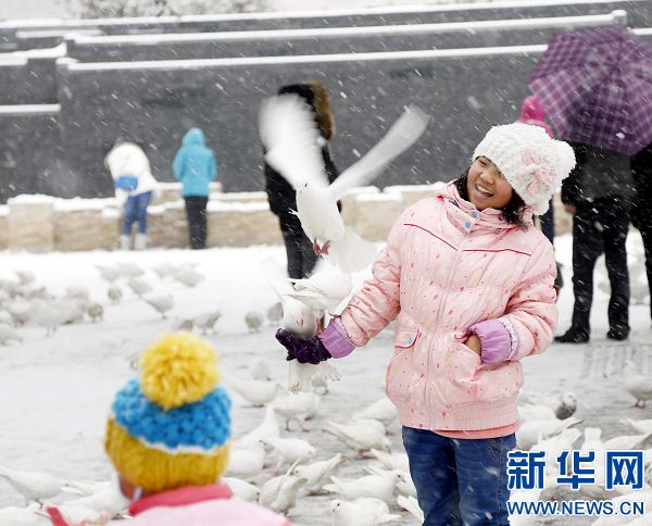 2月5日,孩子在鄭州紫荊山公園里賞雪喂鴿子。