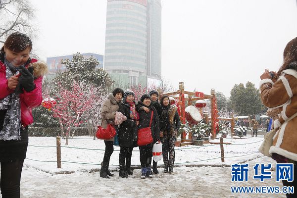 2月5日,人們?cè)卩嵵葑锨G山公園里同雪景合影留念。