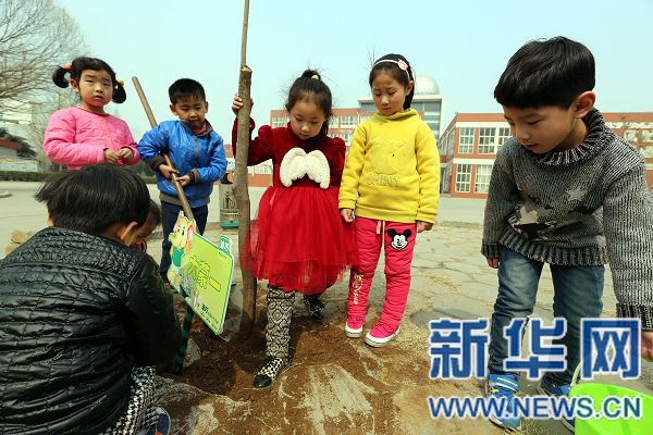 3月10日,河南省安陽(yáng)市婦女兒童活動(dòng)中心幼兒園的孩子們?cè)谠簝?nèi)栽植綠化景觀樹(shù)。