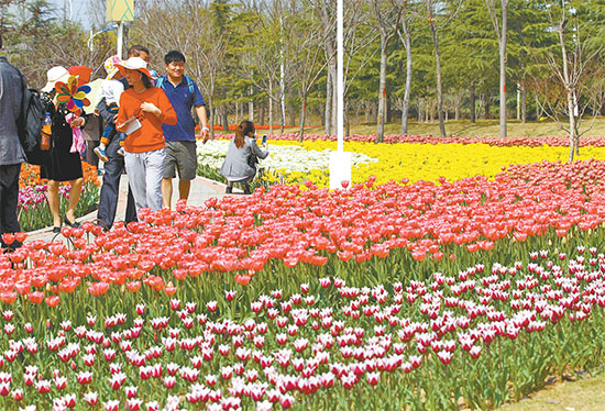 昨天氣溫繼續(xù)上升,綠博園的郁金香提前盛開。一些游客甚至穿著短褲來看花。