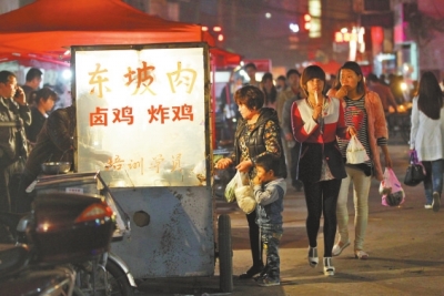 除了真真切切地滿足味蕾,城中村的小吃亦是極大的視覺享受。特別是在夏天晚上,長長的街道兩側(cè)盡是露天擺放的各色小吃,遠遠望去頗為壯觀,什么開封的雞血湯,豫東的吊爐燒餅,色澤鮮亮的道口燒雞……各色美食在燈光下散發(fā)出誘人的味道。置身其間,目光所至,盡是人間草根美食,常有目不暇接之感,仿佛顧盼之間,就已感受了這些美味。