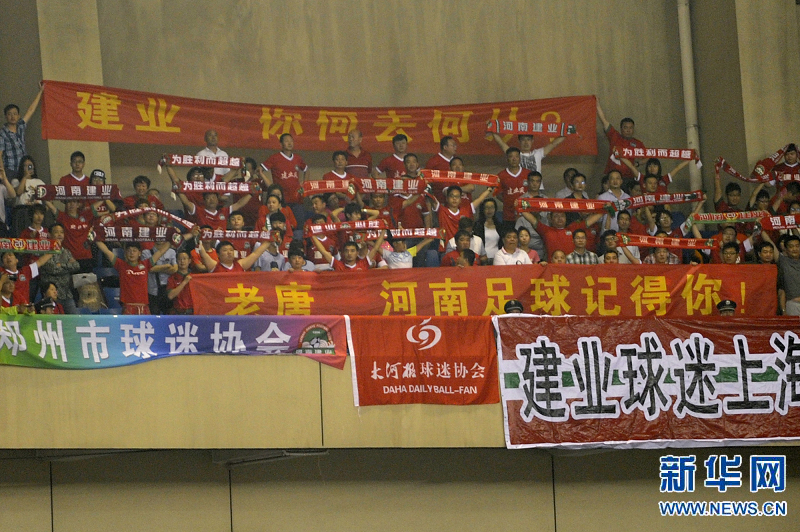 5月25日,河南建業(yè)隊球迷在看臺上打出橫幅感謝主教練唐堯東。