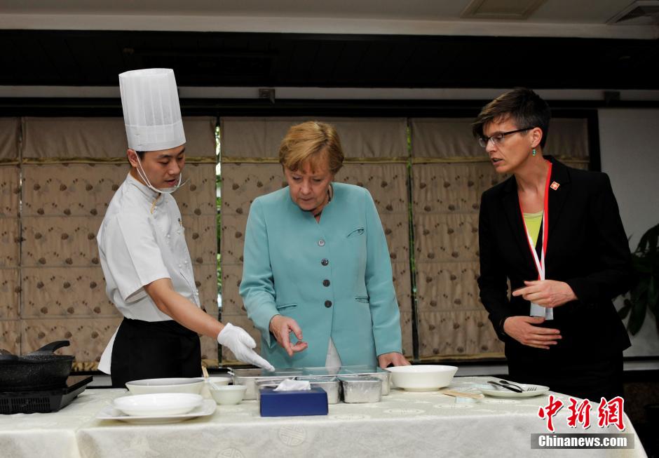 7月6日,應中國國務院總理李克強邀請,德意志聯(lián)邦共和國總理安格拉·默克爾開始訪問中國。位于中國西部地區(qū)的四川省成都市是其訪華的第一站。圖為默克爾向川菜大廚學習宮保雞丁的做法。中新社發(fā) 安源 攝