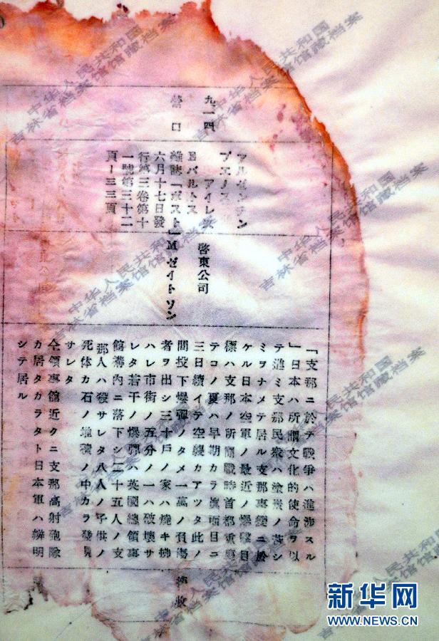 這是關(guān)東憲兵隊司令部、中央檢閱部1939年《通信檢閱月報(九月)》的掃描件,其中記錄了重慶大轟炸期間,1939年一次連續(xù)三天的轟炸造成了25人死亡,其中有3名孩子的慘狀,該信件被扣押處置(7月1日攝)。在吉林省檔案館最新公布的一批侵華日軍檔案中,有多處記述了日軍曾在侵華期間對重慶、長沙等中國城市進行了慘烈的轟炸。 (新華社記者林宏攝)