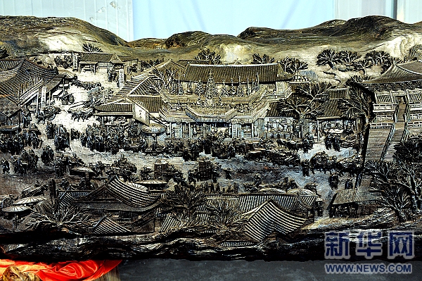 雕刻清明上河圖的巨型烏木的局部(7月9日攝)。