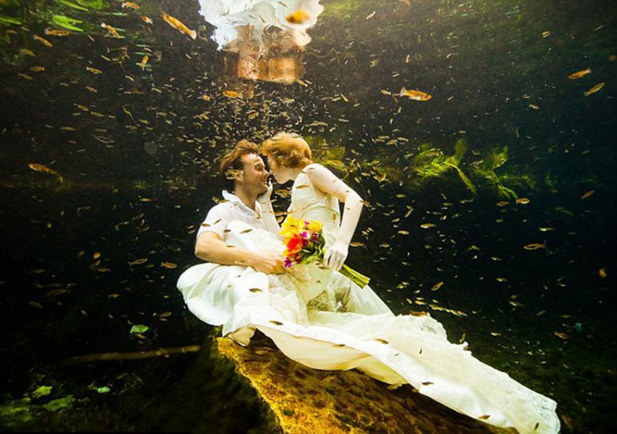 圖為夫婦倆在墨西哥水下的婚禮照(網(wǎng)頁截圖)