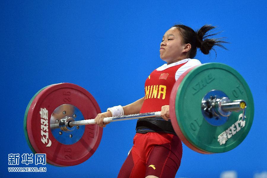 8月17日,中國選手蔣惠花在比賽中。當(dāng)日,2014南京青奧會舉重項目比賽在南京國際博覽中心開賽。在女子48公斤級比賽中,中國選手蔣惠花以193公斤總成績奪冠。(記者郭程攝)