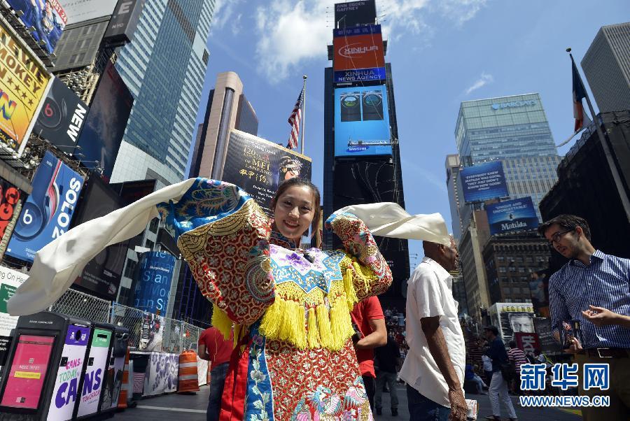 8月19日,北京京劇院梅蘭芳京劇團青年演員王夢婷在紐約時報廣場身著戲服向游客推介京劇藝術(shù)。