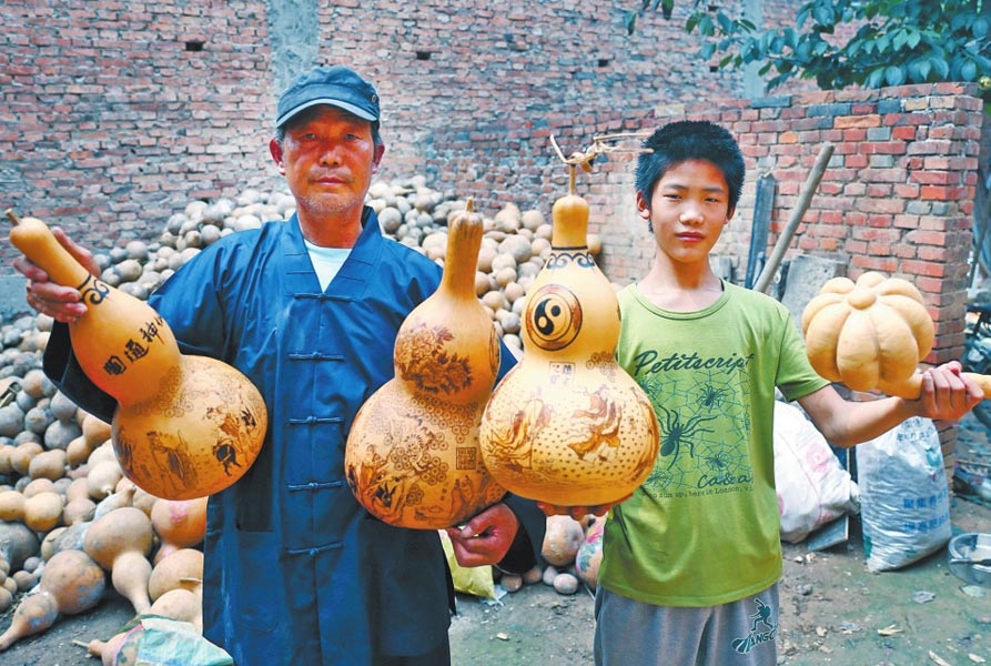 整個暑假,洛龍區(qū)李樓鄉(xiāng)董村13歲的張?zhí)忑埗紱]閑著,只要天氣晴好,他就跟隨父親張書堂騎著三輪車到洛陽市區(qū)賣葫蘆,由于葫蘆精美別致,吸引了不少市民的眼球,為此,大家都親切地稱他們?yōu)椤昂J父子”。據(jù)張書堂介紹,因為兒子小時候愛看“葫蘆娃”動畫片,10年前,他就自學種起了葫蘆,并制作葫蘆工藝品“哄”兒子,F(xiàn)在兒子慢慢長大了,他就靠賣葫蘆供其上學。 (記者 李曉波 邵可強 文 王亞鴿 攝影)