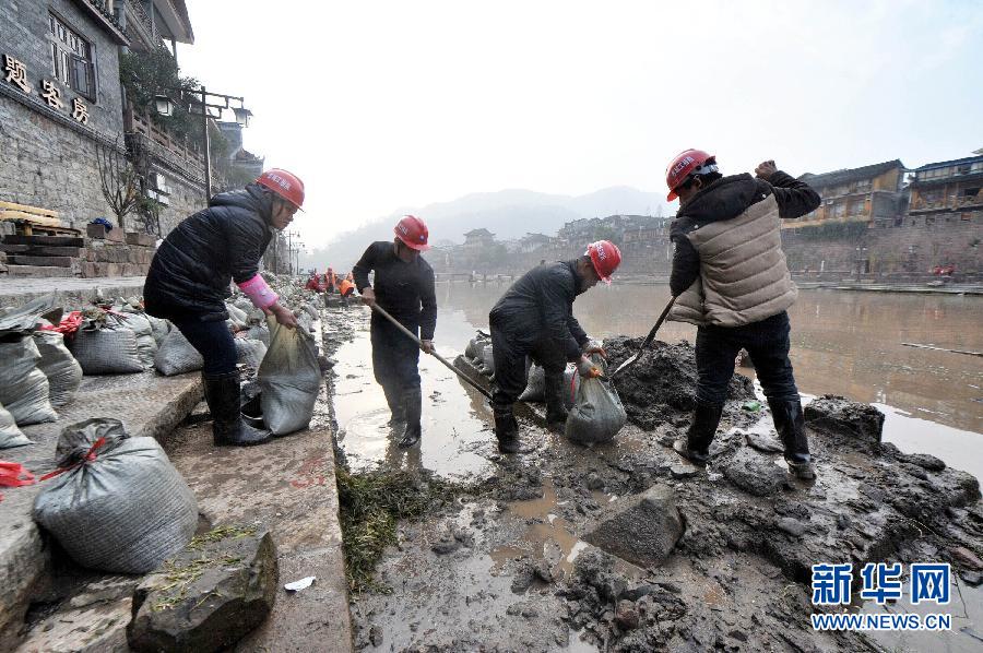 工程人員在鳳凰古城沱江沿岸開展清淤作業(yè)(1月7日攝)。