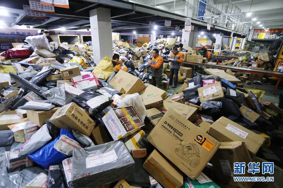 山東省濰坊市區(qū)一快遞公司分揀中心的工作人員在分揀包裹(2014年11月13日攝)。