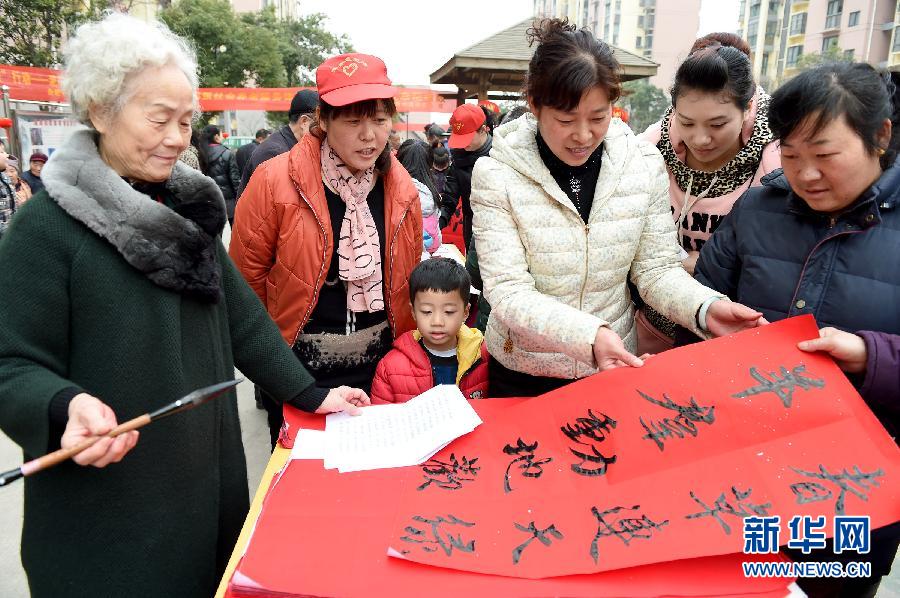2月14日,在淝南社區(qū)迎新春小廟會(huì)上,書法愛好者在現(xiàn)場(chǎng)書寫春聯(lián)贈(zèng)予社區(qū)居民。