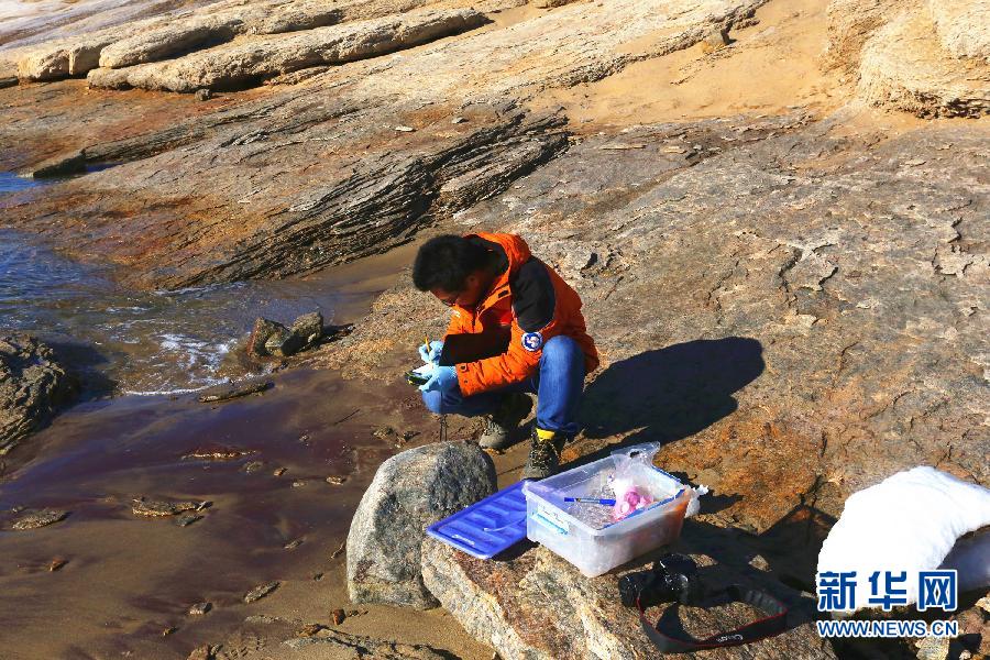 中國第31次南極科考隊隊員鄭宏元在中山站站區(qū)采集水體樣本(3月3日攝)。
