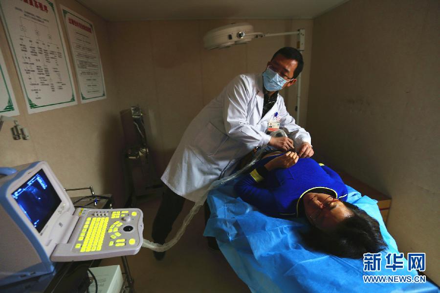 “雪龍”號(hào)船醫(yī)黃罡在為一位生病的隊(duì)員做B超(2014年11月28日攝)。