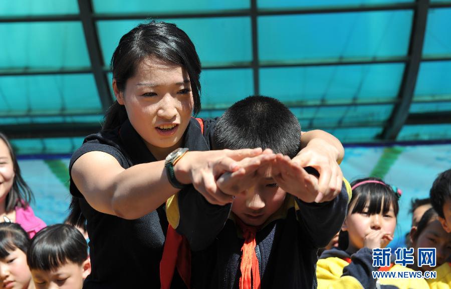 4月13日,奧運(yùn)冠軍羅雪娟(左)為小學(xué)生輔導(dǎo)游泳動(dòng)作!