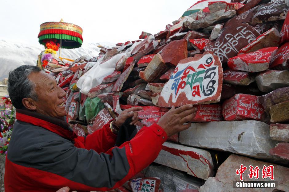 央廣網(wǎng)河南分網(wǎng)消息 2015年4月14日是青海玉樹地震5周年紀念日,玉樹當?shù)孛癖姳M早趕到世界最大瑪尼石堆——嘉那瑪尼石經(jīng)城轉(zhuǎn)經(jīng)。其間,當?shù)孛癖姇䦟iT購買由刻有六字真言瑪尼石堆放于此,為地震中逝去的親人寄托哀思,為今后美好生活祈福。圖為一名藏族民眾將購買的瑪尼石堆放于石經(jīng)城。