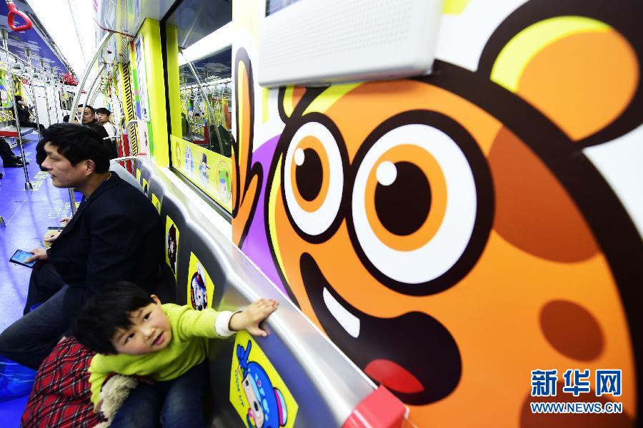 4月14日,一名小乘客被動(dòng)漫地鐵專(zhuān)列車(chē)廂內(nèi)的動(dòng)漫形象所吸引。
