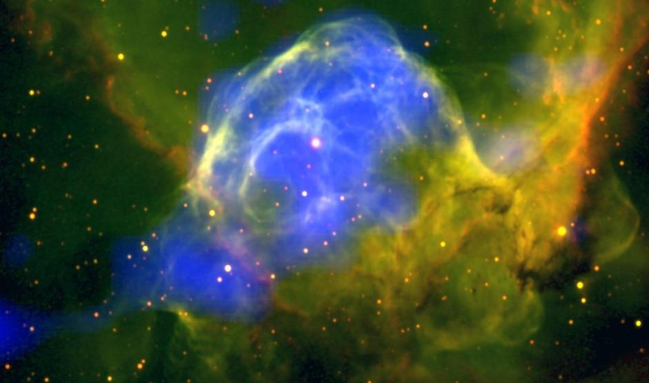 央廣網(wǎng)河南分網(wǎng)消息 近日,歐洲航天局公布了多鏡片X射線觀測衛(wèi)星拍攝到NGC 2359星云的多彩圖像。明亮的藍(lán)色斑塊代表X射線的輻射情況,紅色和綠色區(qū)域代表氫和氧離子。NGC 2359是一個(gè)醒目的發(fā)射星云,它還有另外一個(gè)響亮的名字“雷神的頭盔”。當(dāng)然,也有人因?yàn)樗幸頎畹膫?cè)邊而認(rèn)為它應(yīng)該稱為“鴨子星云”。不管怎樣,它是一個(gè)大小約30光年的泡泡狀星云,是由中央有顆極高溫星球強(qiáng)烈的恒星風(fēng)所吹出來的,這類星球是一種稱為“沃爾夫·拉葉”行星的特殊天體,它是一種罕見的大質(zhì)量藍(lán)巨星,能吹出時(shí)速高達(dá)數(shù)百萬公里的恒星風(fēng)。在恒星風(fēng)和鄰近巨大分子云的相互作用之下,便產(chǎn)生了這個(gè)星云復(fù)雜的外型和彎曲的弓狀激波結(jié)構(gòu)。NGC 2359位于大犬座,距離我們約15,000光年。圖片來源:歐洲航天局