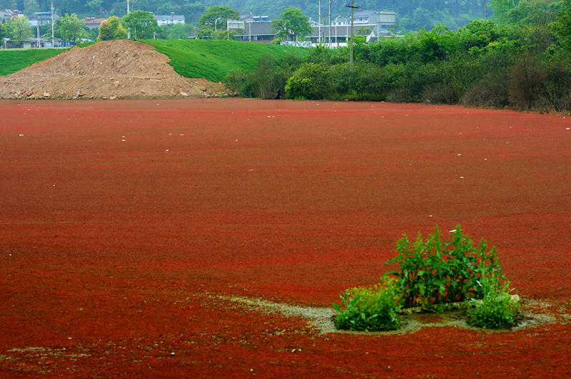 2015年4月24日,長江湖北宜昌段夷陵長江大橋旁一水塘內(nèi)紅色浮萍泛濫,猶如鋪上紅彤彤的地毯。據(jù)了解,由于當(dāng)?shù)鼐用駥⑸钗鬯畞y排到水塘里,加上氣溫的回升,致使水塘水體富營養(yǎng)化,紅色浮萍大面積泛濫,水質(zhì)受到影響,水塘周邊的柑橘樹大量枯死。
