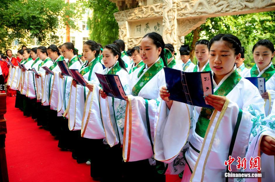 央廣網(wǎng)河南分網(wǎng)消息 6月16日,河北美術(shù)學(xué)院文廟前彩旗飄揚(yáng),氣球高懸,659名學(xué)生及全體校領(lǐng)導(dǎo)身著傳統(tǒng)漢服齊聚學(xué)校文廟,在這里隆重舉行2015年河北美術(shù)學(xué)院學(xué)士學(xué)位授予儀式,現(xiàn)場古風(fēng)漢韻,時光仿佛穿越回了“大漢盛世”時期。在贊禮的主持下眾學(xué)子齊誦《孔子贊》并莊重而深情地行三拜之禮。一拜家長,劬勞育我,孝敬事親;二拜導(dǎo)師,傳道授業(yè),永銘師恩;三拜母校,感恩母校,報效國家。面對學(xué)生的三鞠躬行禮,家長、導(dǎo)師、校領(lǐng)導(dǎo)分別回禮。校長甄忠義親自為每一名學(xué)位獲得者“冠頂”,頒發(fā)學(xué)位證書,并親切地與學(xué)生握手祝賀、合影留念,快門閃動,記錄下這莊嚴(yán)、難忘而又幸福的瞬間。 中新社發(fā) 賈敏杰 攝
