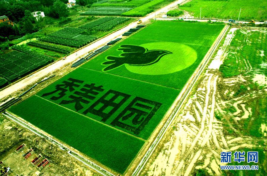 7月10日在安徽廬江拍攝的大型“藝術(shù)稻”作品。近日,一幅大型“藝術(shù)稻”作品在安徽廬江臺創(chuàng)園亮相。該“藝術(shù)稻”作品以綠色、黃色、紫色三種彩色稻為“顏料”,以20畝稻田為“畫布”,繪出“和平鴿”和“秀美田園”圖案。新華社發(fā)(周躍東 攝)