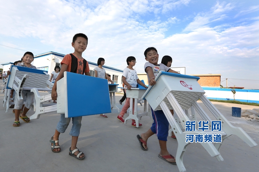 央廣網(wǎng)河南分網(wǎng)消息 2015年8月26日,河南省安陽縣蔣村鎮(zhèn)李莊小學(xué),該校老師為學(xué)生安裝嶄新的課桌椅。