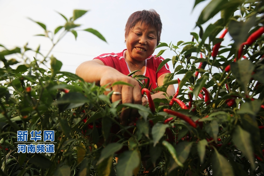 8月27日,平頂山市寶豐縣辣椒種植合作社社員正在收獲“訂單辣椒”。