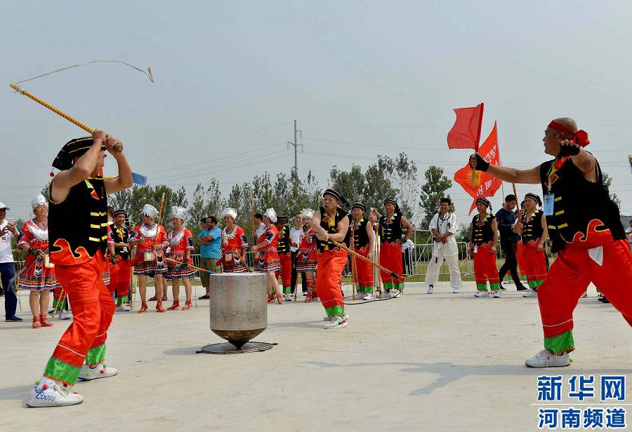 9月20日,在第三屆中國(夏邑)鞭陀文化節(jié)開幕式上,來自貴州的選手鞭打486公斤的大陀螺。