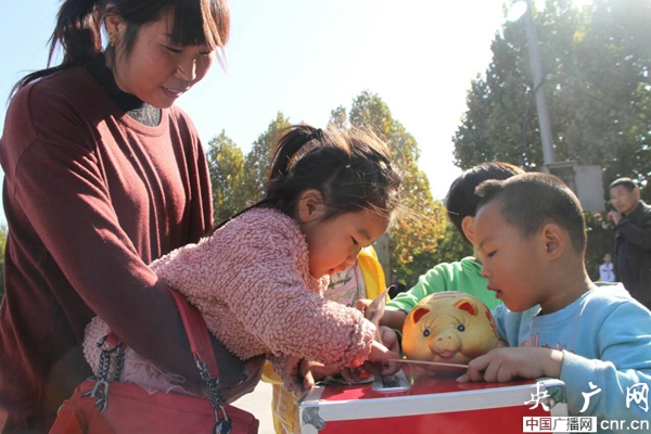 當(dāng)日上午,募捐活動在中牟縣新世紀(jì)廣場舉行,政府機(jī)關(guān)公務(wù)員、企業(yè)家、農(nóng)民、環(huán)衛(wèi)工人、教師、小學(xué)生……眾多社會愛心人士紛紛來到募捐活動現(xiàn)場奉獻(xiàn)慈善愛心;顒蝇F(xiàn)場年齡最小的是來自官渡路小學(xué)三年級9歲小學(xué)生曹原,曹原把自己的儲錢罐的壓歲錢一股腦兒倒進(jìn)了募捐箱里:“我也要獻(xiàn)一份愛心,我也要幫助別人!