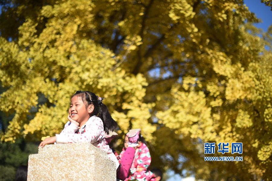 11月1日,一名小朋友在清華大學校園內(nèi)金黃的銀杏樹下留影。晚秋時節(jié),北京清華大學校園內(nèi)清華路旁的銀杏樹葉一片金黃,在陽光下飽滿明亮,猶如一幅金色畫卷。 新華社記者 陳曄華 攝