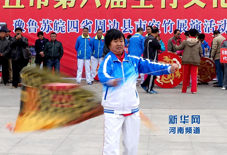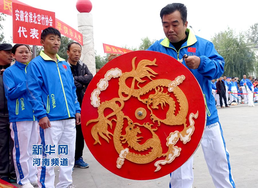 來自安徽淮北市空竹協(xié)會(huì)代表隊(duì)的空竹愛好者在表演抖特大空竹技藝。