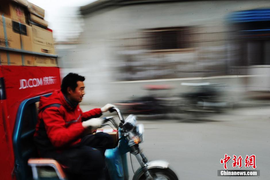 央廣網(wǎng)河南分網(wǎng)消息 11月11日傍晚,一場(chǎng)斷斷續(xù)續(xù)的零星小雨加劇了甘肅省會(huì)蘭州初冬的寒意,戶外逼人的寒風(fēng)催促著城區(qū)上班一族回家的步伐。忙得焦頭爛額的京東派送員蒲澤民一天沒顧得上吃飯,此時(shí)他又駕駛著一輛滿載貨物的三輪摩托,直奔回家高峰期的各個(gè)住宅小區(qū)“倒時(shí)差”送貨。 楊艷敏 攝