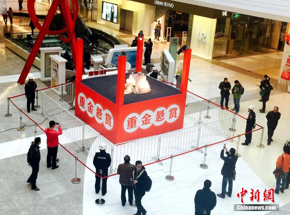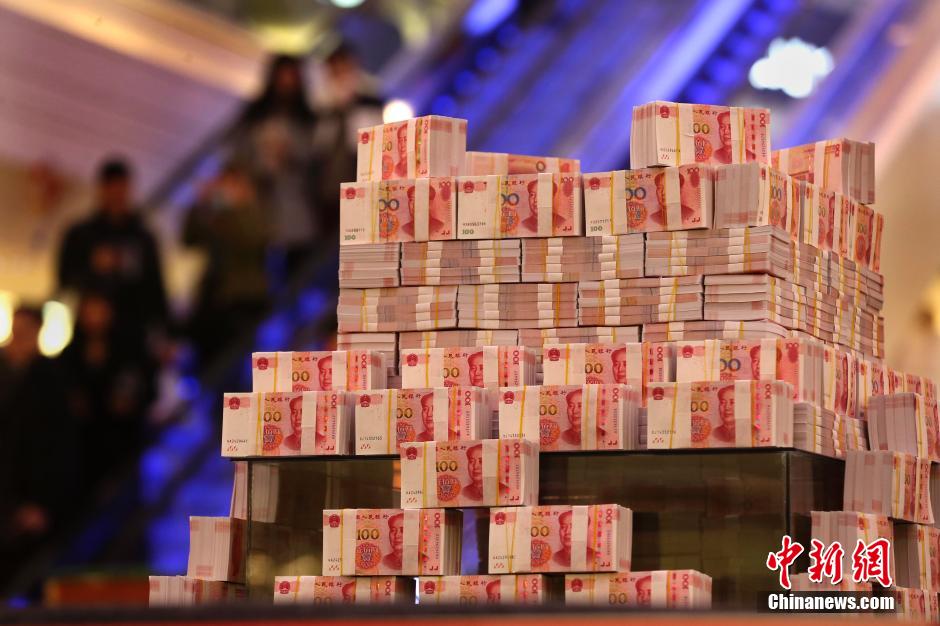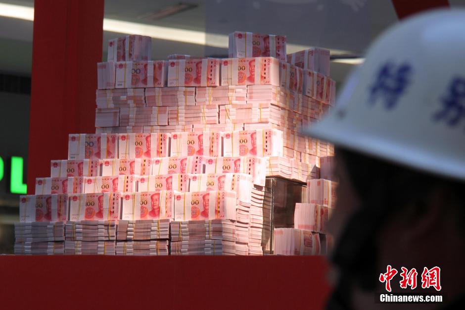 11月26日,河南省洛陽市一家商場內(nèi),在打著“重金懸賞”字樣的高臺上,千萬現(xiàn)金堆起“錢山”,現(xiàn)場圍起兩道警戒線,四周由保安看管。