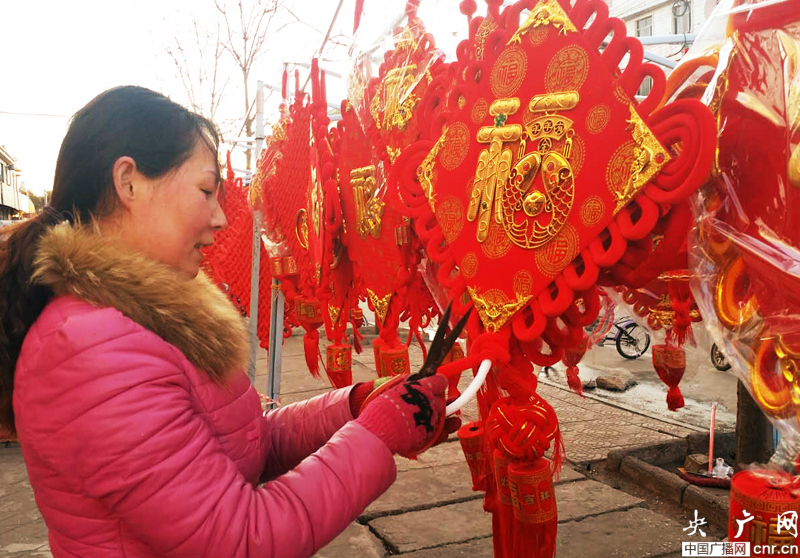 央廣網(wǎng)河南分網(wǎng)消息 當日是臘月二十八,民間有臘月二十八家中貼畫畫的民俗,河南省寶豐縣猴年飾品市場紅紅火火,市民在市場挑選自己滿意的過年吉祥物,高高興興過大年。王雙正攝