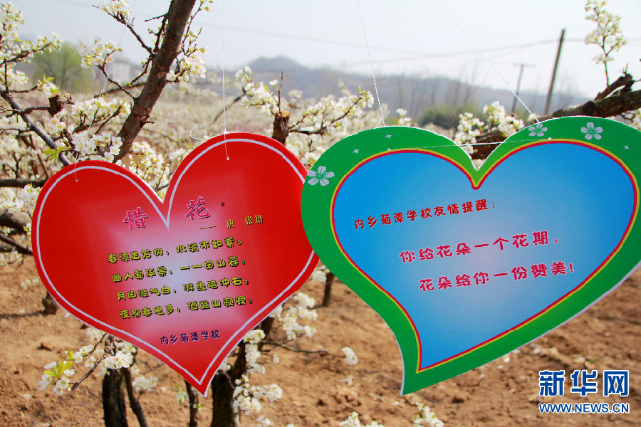 河南內(nèi)鄉(xiāng)縣油桃溝占地面積10萬(wàn)畝,每到桃花盛開(kāi)的時(shí)節(jié),幾萬(wàn)名游客前來(lái)賞花,毀樹(shù)、傷花現(xiàn)象經(jīng)常發(fā)生,果農(nóng)遭受一定的損失。3月18日,內(nèi)鄉(xiāng)縣菊潭學(xué)校組織100名學(xué)生,在含苞欲放的果樹(shù)枝上懸掛寫有優(yōu)美詩(shī)句的1000余塊宣傳牌,警示游客在觀賞美景的同時(shí)要保護(hù)環(huán)境,呵護(hù)自然。這些精美的警示牌,成為桃花溝內(nèi)亮麗的風(fēng)景。新華網(wǎng)發(fā)(張中立 攝)