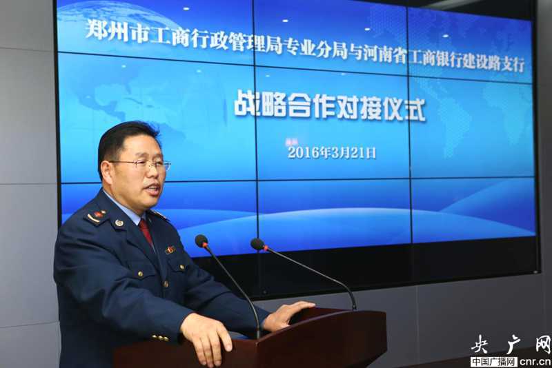 央廣網(wǎng)河南分網(wǎng)3月22日消息 3月21日下午,鄭州市工商局專業(yè)分局與工行鄭州建設(shè)路支行在分局四樓監(jiān)控大廳舉辦“助推鄭州小微企業(yè)發(fā)展全面戰(zhàn)略合作對(duì)接儀式”, 助推小微企業(yè)“加速飛行”。鄭州市工商局專業(yè)分局黨總支書記、局長(zhǎng)李建華,工行鄭州建設(shè)路支行行長(zhǎng)李仌等出席對(duì)接儀式。