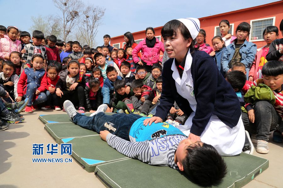 3月28日,一名醫(yī)務(wù)工作者在河南省溫縣徐堡小學(xué)指導(dǎo)學(xué)生學(xué)習(xí)心肺復(fù)蘇急救技能。