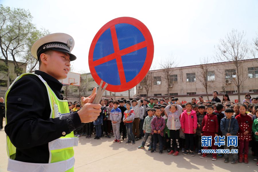 3月28日,一名交警在河南省溫縣徐堡小學(xué)指導(dǎo)學(xué)生認(rèn)識(shí)交通標(biāo)識(shí)。