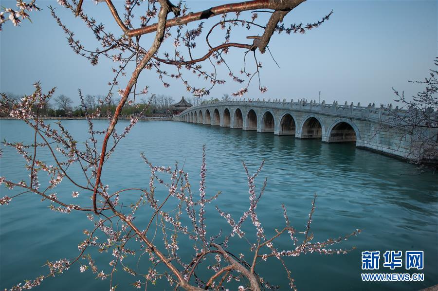 3月29日傍晚,北京頤和園南湖島上的一株櫻花與遠(yuǎn)處的十七孔橋相映成趣。新華社發(fā)(蒲東峰 攝)
