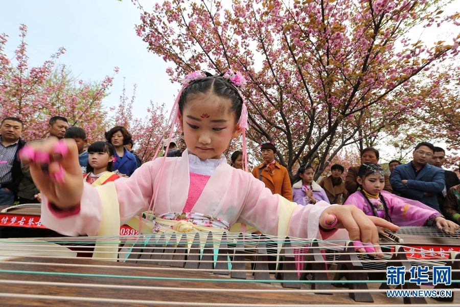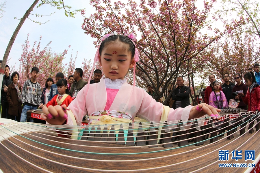 2016年4月3日,鶴壁市淇濱區(qū)櫻花大道的櫻花樹下,6歲的李書瑤正在為游客彈奏古箏《紅顏劫》。