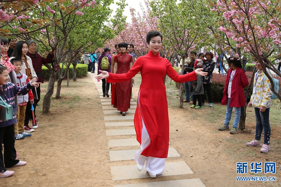 2016年4月3日,游客在欣賞櫻花的同時,還可以品櫻花茶藝、看民俗表演、觀旗袍走秀、聽街頭音樂……