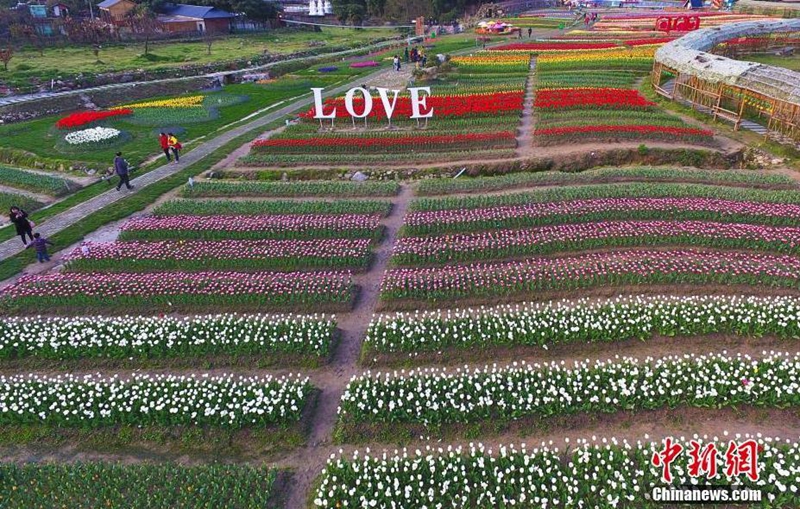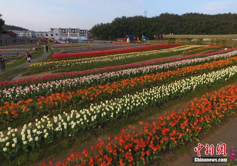 3月25日,在江西南昌市灣里區(qū)歡樂(lè)葵園景區(qū),50多個(gè)品種、50余萬(wàn)株郁金香相繼綻放,紅的、粉的、黃的、白的等各色郁金香吸引眾多市民和游客前來(lái)踏青賞花。高空俯瞰下的郁金香花田繽紛多彩,為游客帶來(lái)夢(mèng)幻般的視覺(jué)盛宴。劉占昆 攝