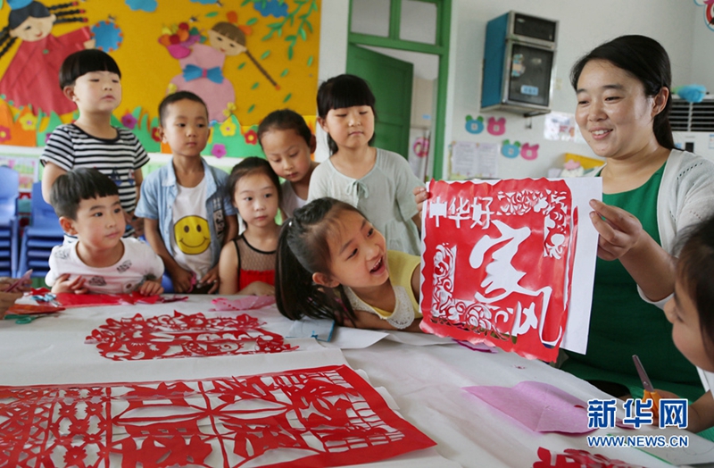 6月9日,寶豐縣匯佳幼兒園的小朋友和老師一起創(chuàng)作剪紙作品《中華好家風(fēng)》。在全國(guó)首個(gè)“文化和自然遺產(chǎn)日”到來(lái)之際,河南省寶豐縣將非遺剪紙藝術(shù)與廉政文化建設(shè)有機(jī)結(jié)合,制作以《廉潔是!贰吨腥A好家風(fēng)》為主題的剪紙作品,營(yíng)造廉潔文化進(jìn)校園、進(jìn)社區(qū)、進(jìn)農(nóng)村的氛圍。該縣通過(guò)舉辦廉政剪紙展、剪紙藝人現(xiàn)場(chǎng)剪紙展示活動(dòng)等形式,讓市民在欣賞非遺剪紙藝術(shù)的同時(shí),受到廉政文化的熏陶,同時(shí)也傳播非遺文化。 -