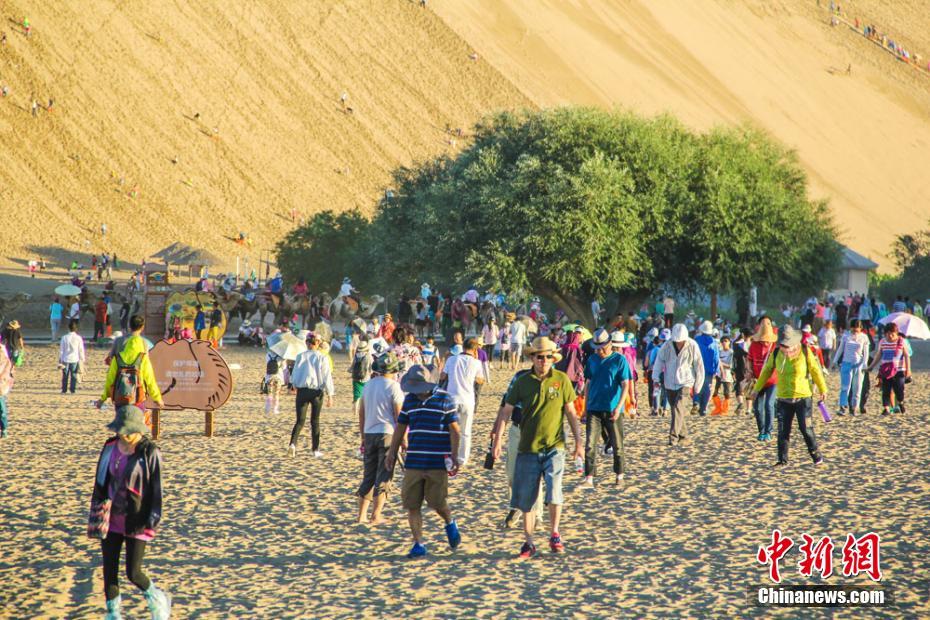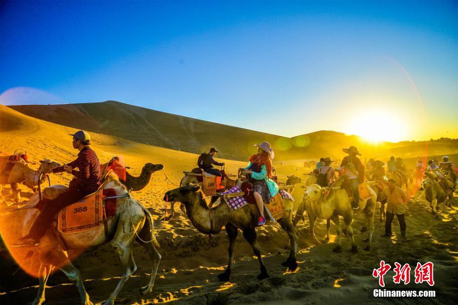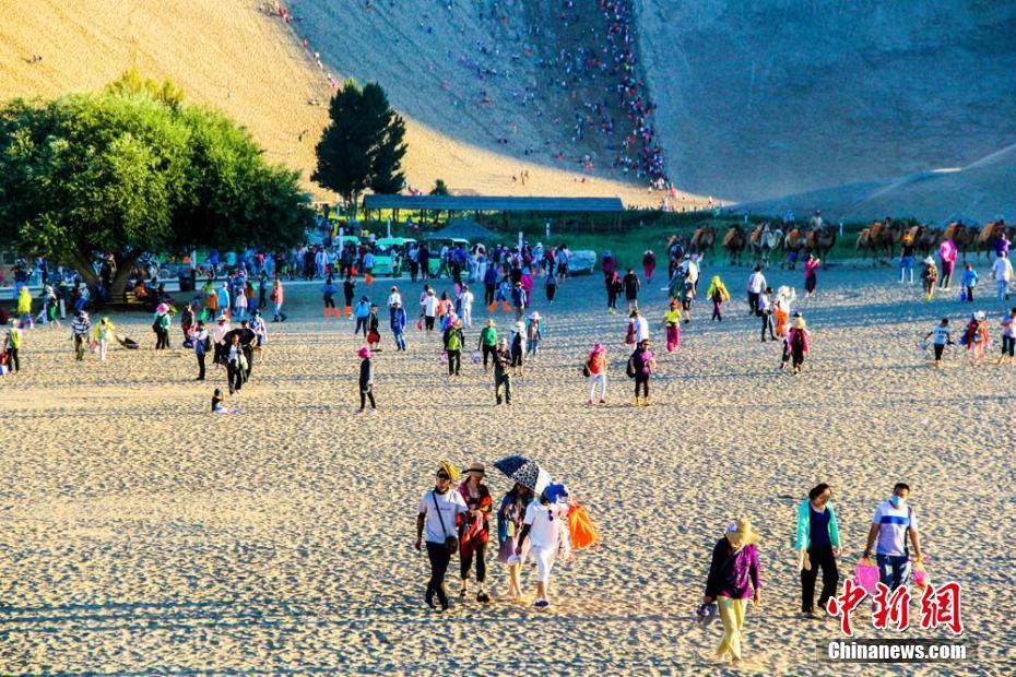 8月伊始,絲綢之路國(guó)際旅游名城甘肅敦煌旅游持續(xù)火爆、旅游熱潮一浪高過(guò)一浪。鳴沙山下人頭攢動(dòng),月牙泉畔游人如織;長(zhǎng)長(zhǎng)的駝隊(duì)蜿蜒遠(yuǎn)去,一直持續(xù)到月亮升起;鳴沙山上人聲鼎沸,歡歌笑語(yǔ)回響在大漠深處。連日來(lái),幾場(chǎng)降雨為敦煌大漠“消暑”降溫,大批海內(nèi)外游客紛至沓來(lái),一睹敦煌迷人的大漠風(fēng)光。據(jù)鳴沙山月牙泉景區(qū)統(tǒng)計(jì),進(jìn)入8月以來(lái),每天進(jìn)入該景區(qū)的游客達(dá)到2.5萬(wàn)人次,景區(qū)內(nèi)旅游秩序井然。王斌銀 攝 -