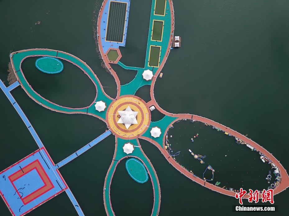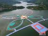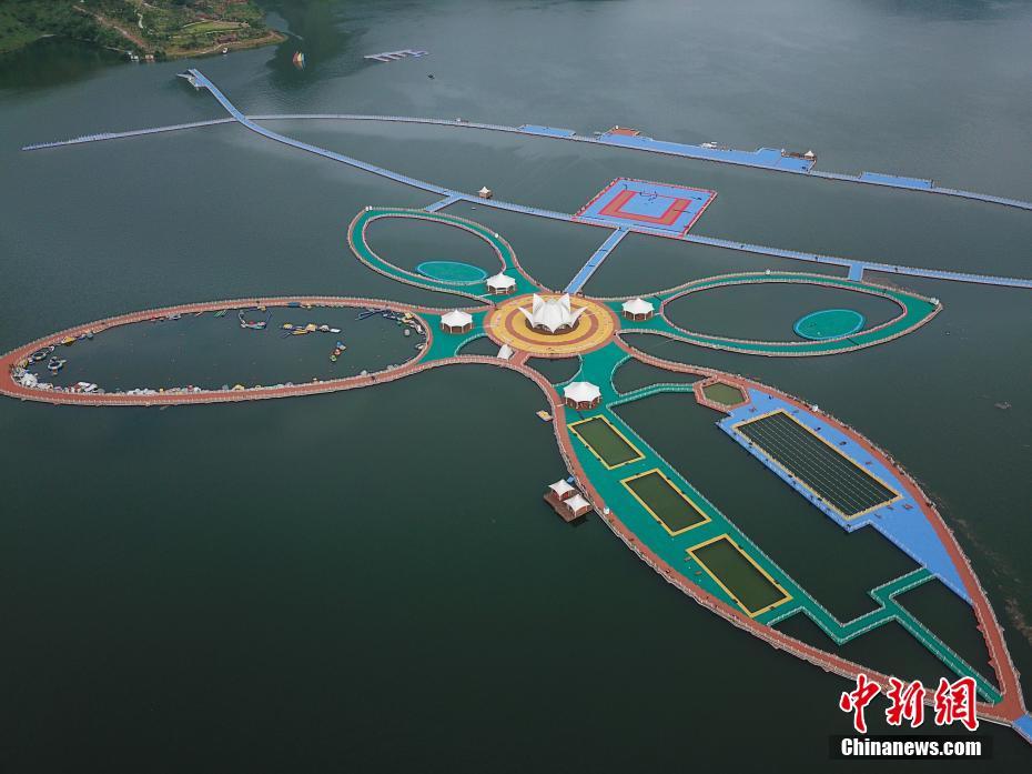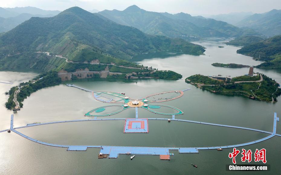 9月11日,航拍宛如巨型蝴蝶的貴州羅甸縣紅水河漂浮棧道。位于貴州省黔南州羅甸縣紅水河鎮(zhèn)的漂浮棧道,由222500個浮體組成,總長度3.7公里。中新社記者 賀俊怡 攝